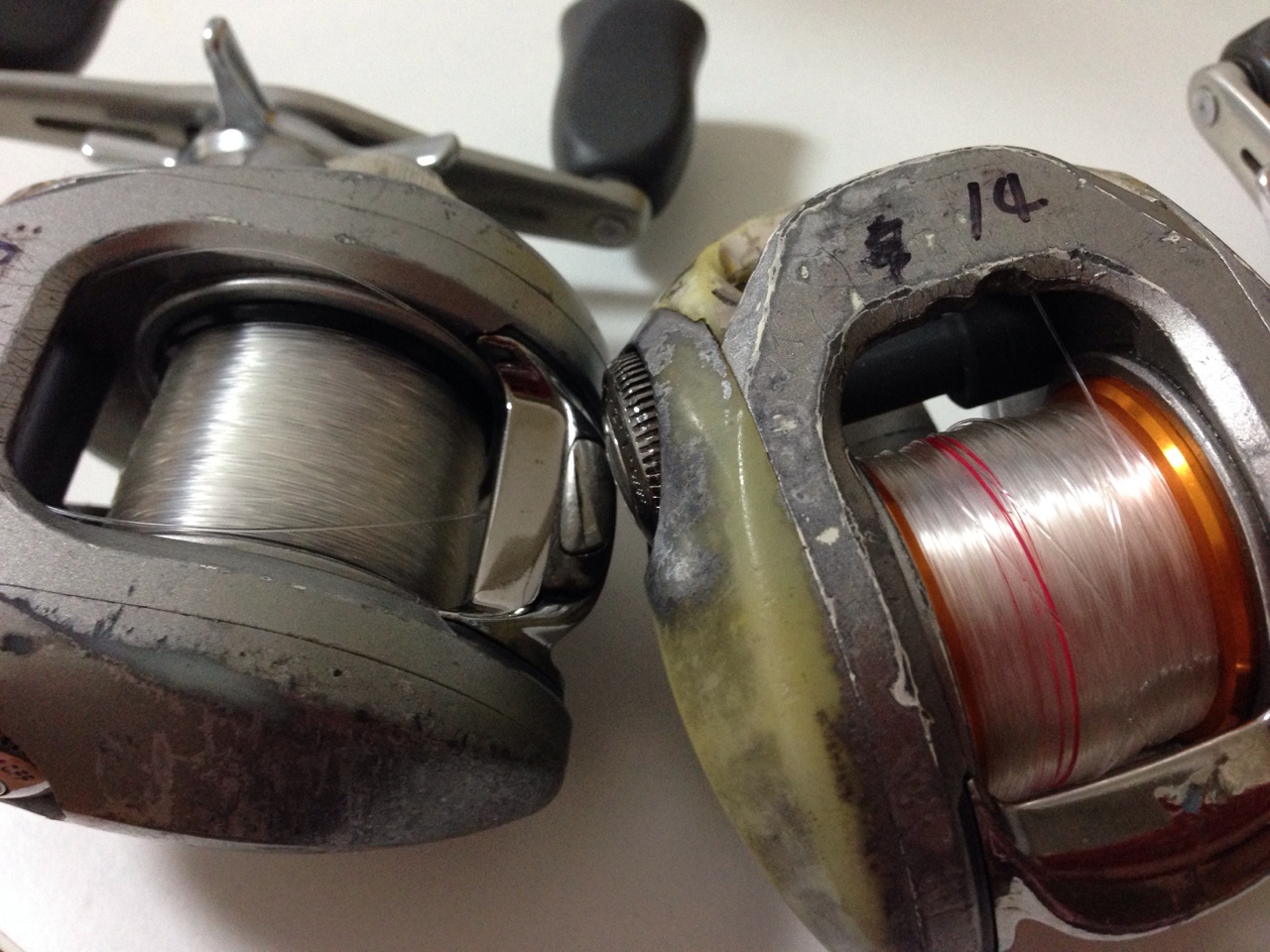突然ですが僕はいまだにダイワのTD-Zを愛用しています。生産終了から7年以上経つのにもかかわらず、愛用者が多いことからメーカーもパーツをストックしているようです。新しい機種に総入れ替えも何度か検討したのですが、もはや身体の一部!というと大げさだけど、完全に馴染んでいるし一度も不便に感じたことがありません。もちろん、2年に一回はオーバーホールはしてますけどね。で、写真右側のオレンジのスプールなのですが、昨年ダイワさんがリリースしたSVというもので、これがTD-Zにも対応しているんです。ノーマルスプールよりも軽い力でスムースに回転し、そのくせブレーキの利きがいいんです。とくに10g以下のピッチングではポテンシャルを発揮してくれます。ただ、キャスティングでは予測着水点の到達前に失速するから多少の慣れが必要かも。ん〜、ここまで使い込んだのだからメーカーにパーツ在庫が無くなるまで使うかな(笑)。